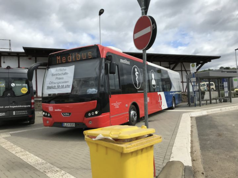 Seit dem 25. Juli parkt der Bus, der von der Kassenärztlichen Vereinigung bereitgestellt wird, in Bad Neuenahr am Bahnhof, in Ahrweiler am Bahnhof gibt es außerdem einen Container des Roten Kreuzes. Die Zentralen sind wichtige Bindeglieder zwischen medizinischer Notversorgung durch die Hilfsorganisationen in der Stadt und der Versorgung im Krankenhaus.